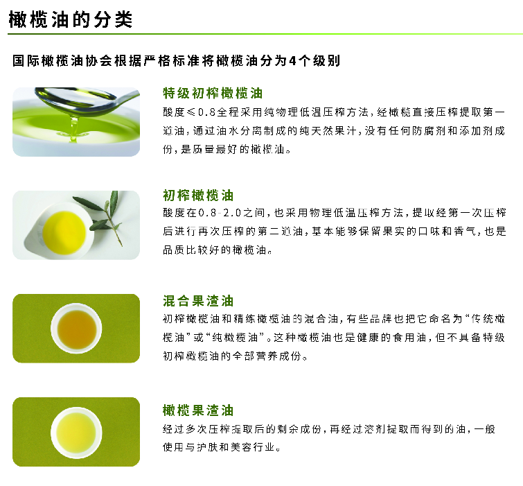 國際橄欖油協(xié)會根據(jù)嚴格標(biāo)準(zhǔn)將橄欖油分為4個級別: