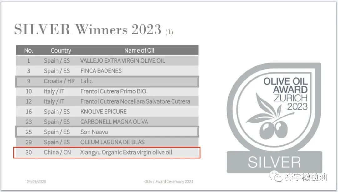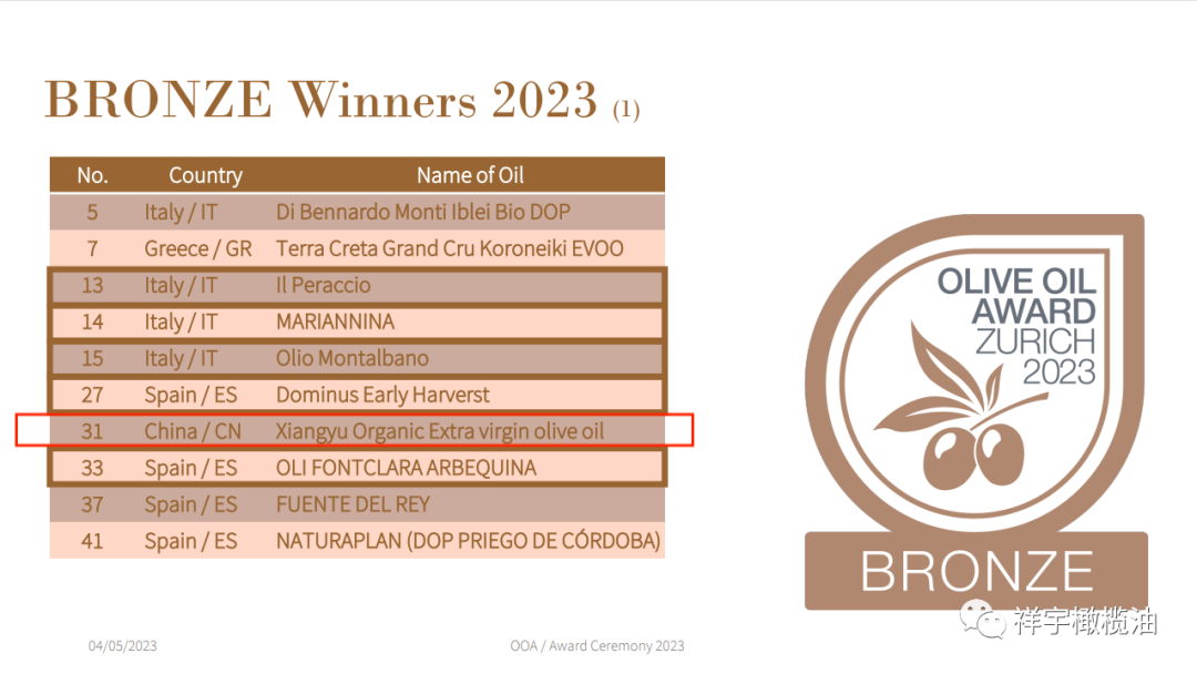 祥宇選送的特級(jí)初榨橄欖油在10個(gè)國(guó)家126個(gè)樣品中獲得1銀1銅的好成績(jī)。