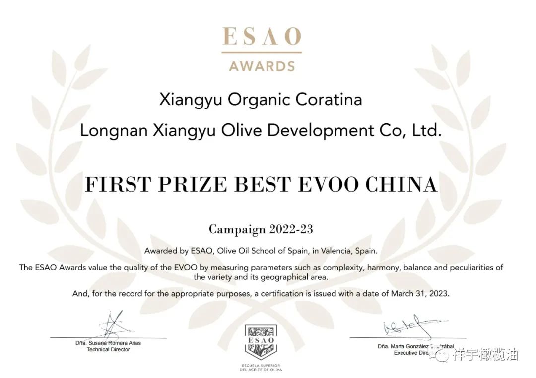 “ESAO Awards”中榮獲中國最佳特級初榨橄欖油一等獎,